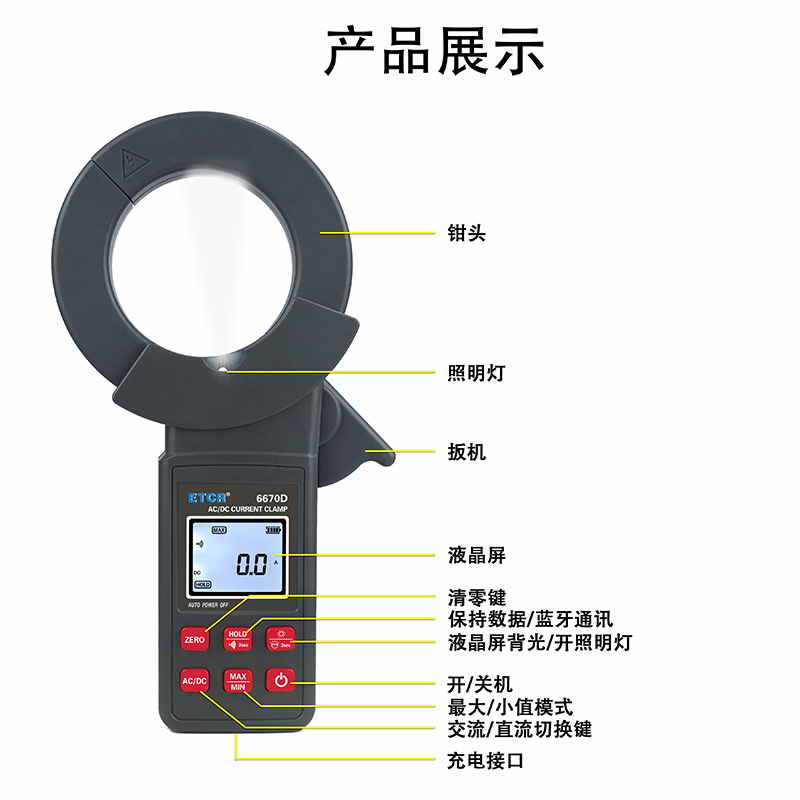 ETCR6670D大口徑直流/交流鉗形電流表鉗表具有直流/交流真有效值測(cè)量、最大值/最小值/平均值測(cè)量等功能。鉗表具有數(shù)據(jù)保持、藍(lán)牙通訊功能,使用大容量鋰電池type-c充電口,是一款新型的電工安全檢測(cè)必備工具。
