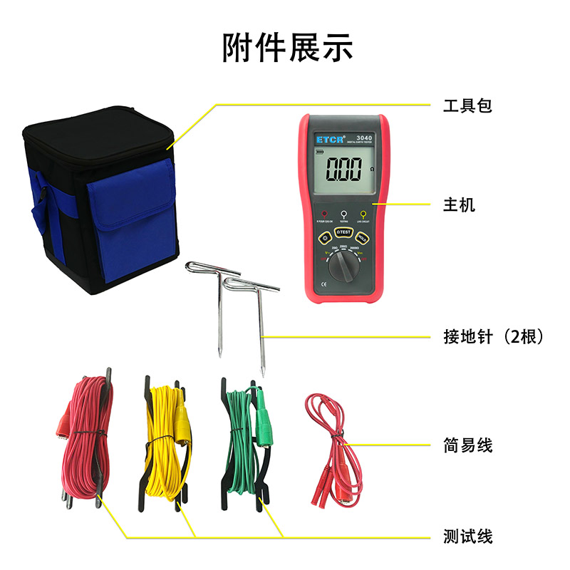 ETCR3040數(shù)字式接地電阻測(cè)試儀0.10Ω~2000Ω——0V~300V AC/DC輔助樁、交直流電壓報(bào)警——各端口間AC 280V/3秒