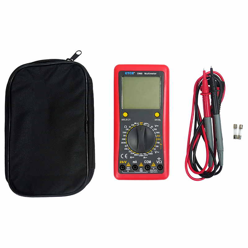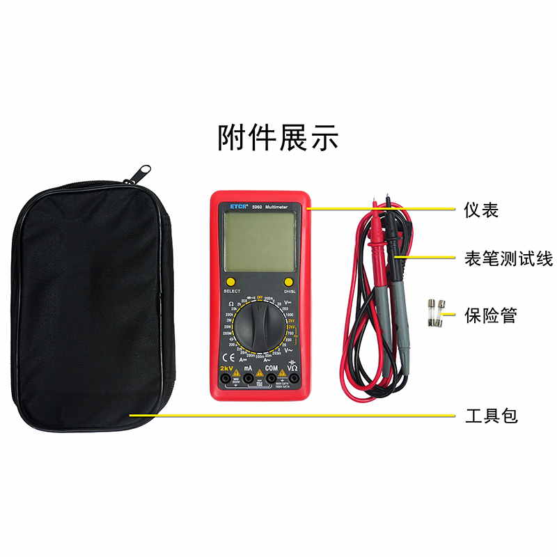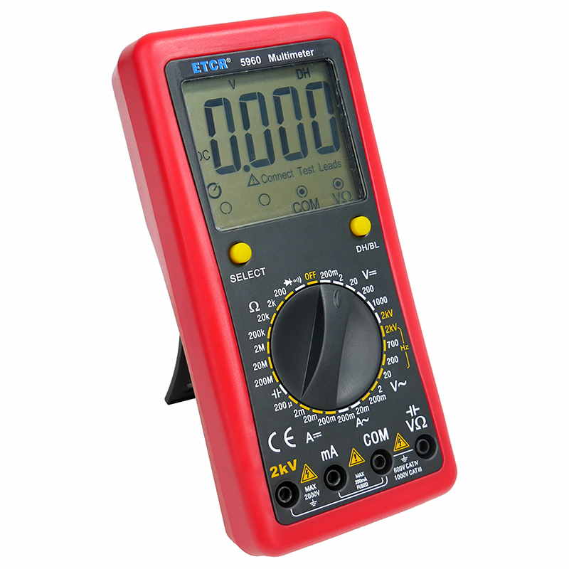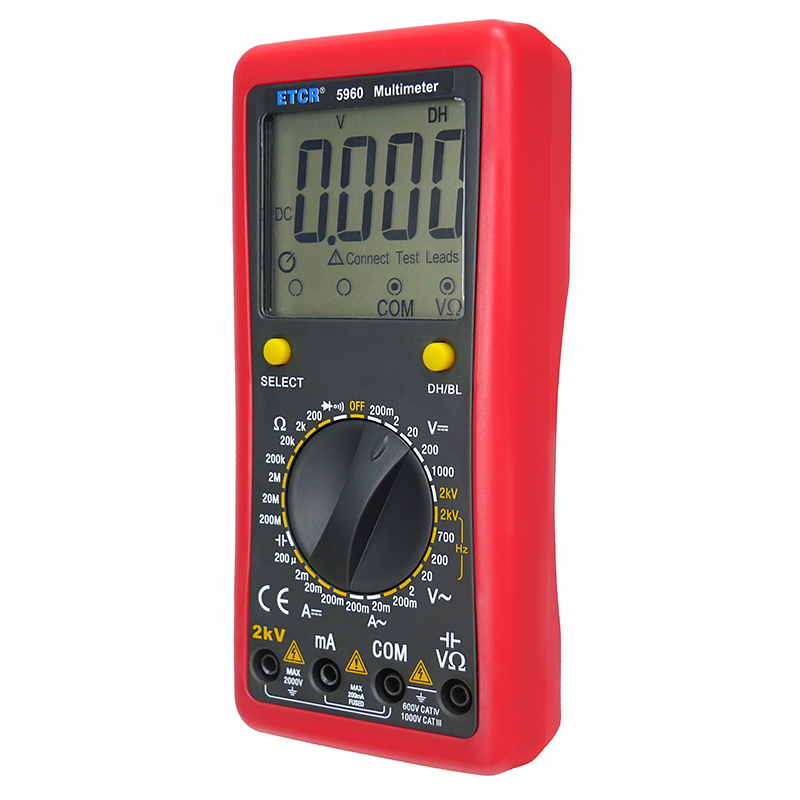 ETCR5960數(shù)字萬用表又稱數(shù)字萬能表、智能萬用表,是一種性能穩(wěn)定、用電池供電的高可靠性數(shù)字萬用表,它用單片機管理,全功能有過載保護。儀表能顯示各檔表筆和插座應插的位置,提示您不要插錯位置。該儀表能測量直流電壓和電流、交流真有效值電壓和電流、電阻、電容、二極管正向壓降、電路通斷等。測量準確、性能穩(wěn)定、安全可靠,是您理想的測試維修工具!