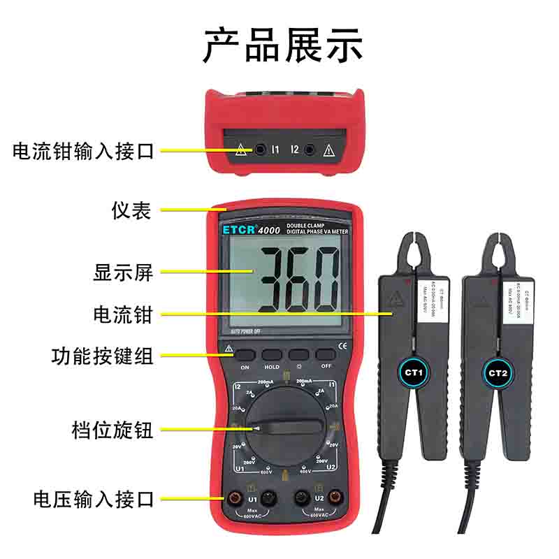 ETCR4000數(shù)字雙鉗相位伏安表Φ8mm0~360°0.00V~600V0.0mA~20.0A--