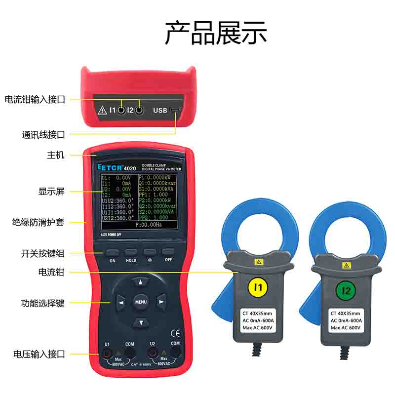 | ETCR4000數(shù)字雙鉗相位伏安表 | Φ8mm | 0~360° | 0.00V~600V | 0.0mA~20.0A | -- |