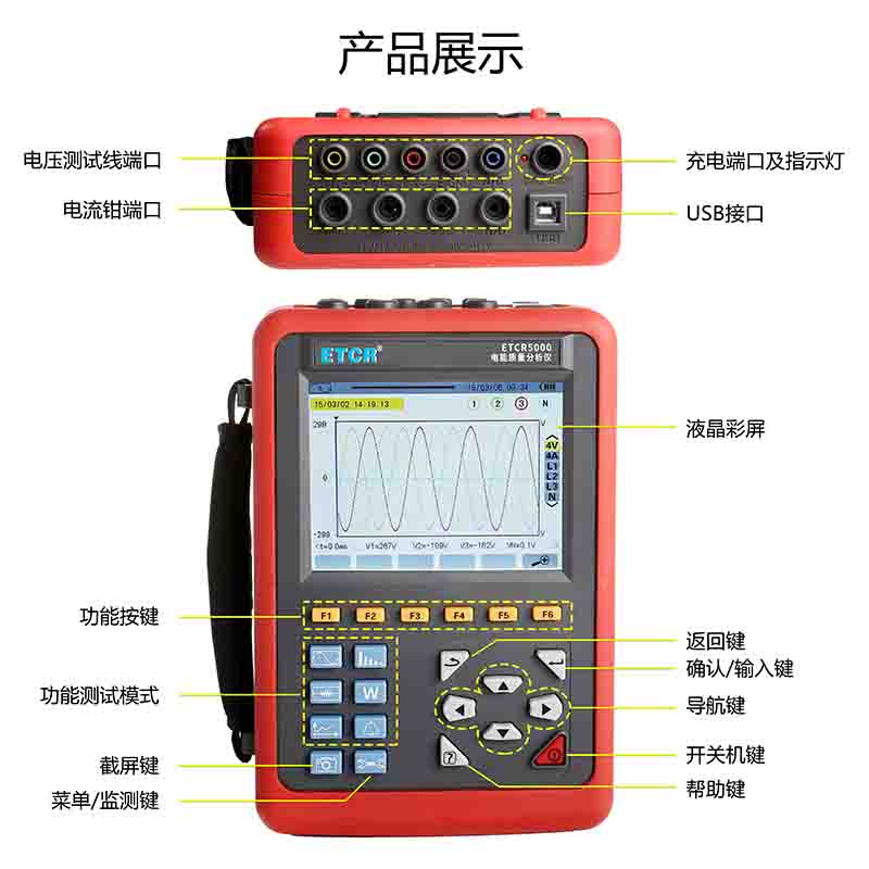 3、四通道電流、電壓測量,同時捕捉和記錄電量參數、波形,4、超大液晶彩屏顯示,高分辨率。