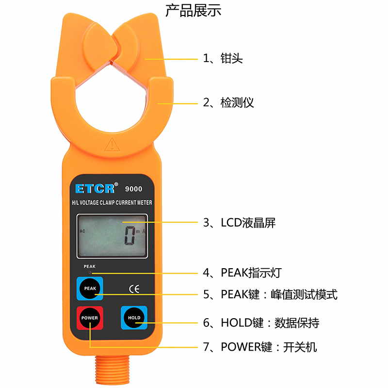 ETCR9000高低壓鉗形電流表鉗頭與引導(dǎo)區(qū)創(chuàng)新的一體化設(shè)計(jì),通過按壓或退拔絕緣桿能快速方便鉗夾或撤離被測(cè)導(dǎo)線,安全快捷。儀表還具有峰值保持、數(shù)據(jù)保持、數(shù)據(jù)存儲(chǔ)等功能。