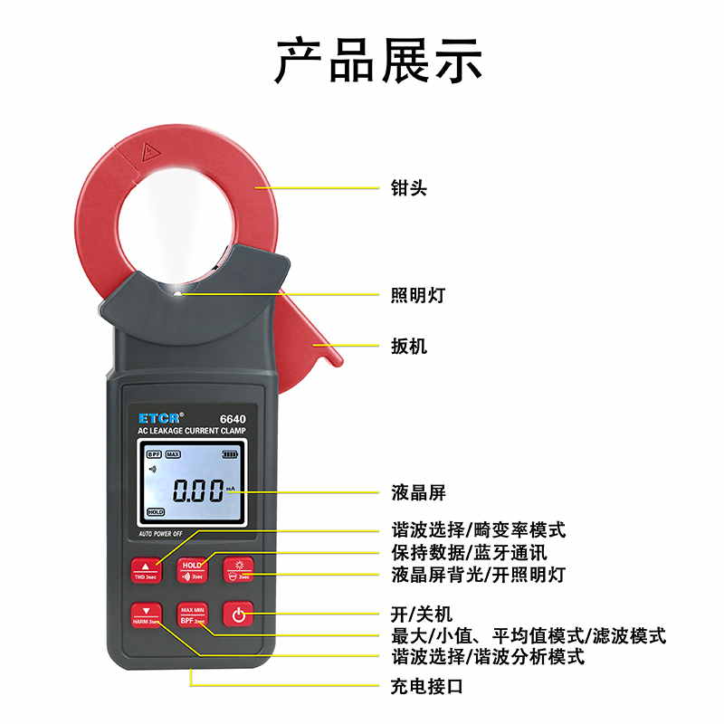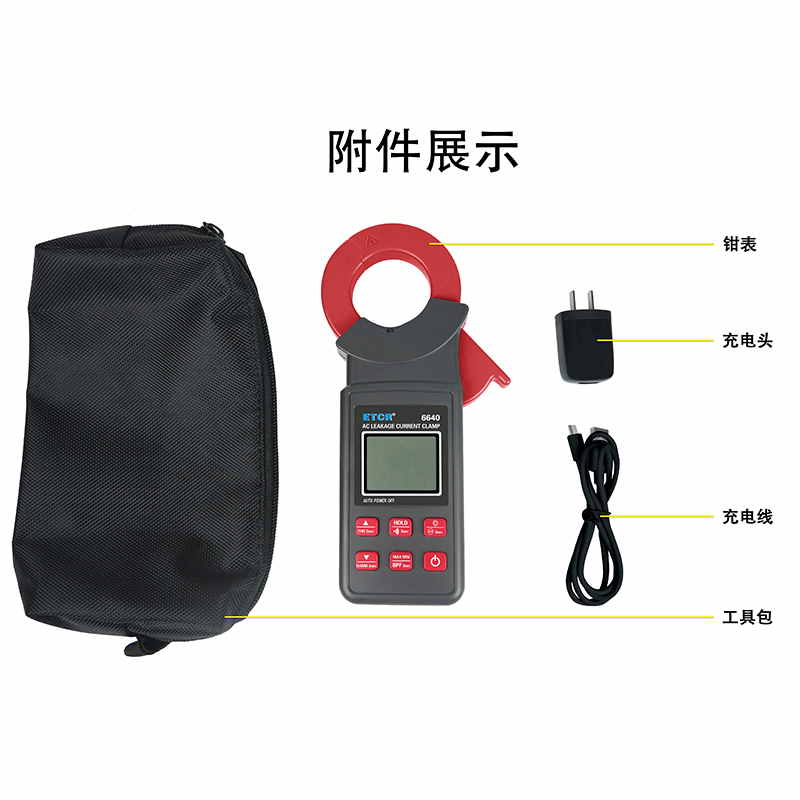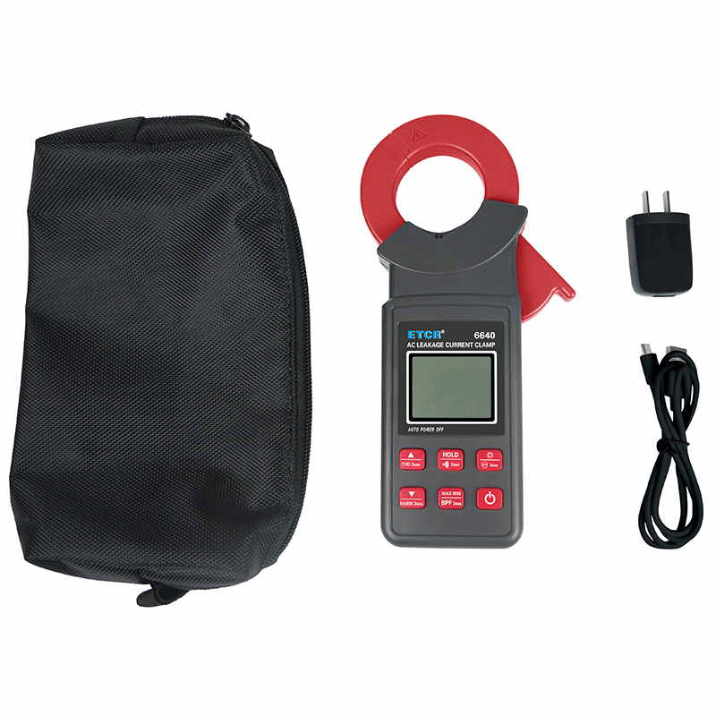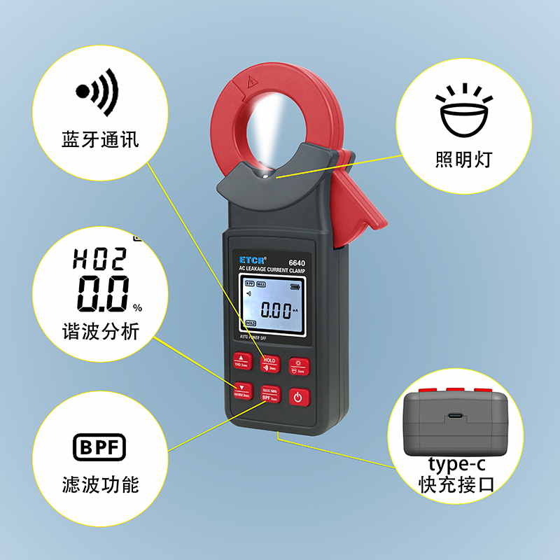 ETCR6640鉗形漏電流表可測(cè)試40Hz~1kHz頻率范圍的電流。鉗表還具有背光、手電筒、數(shù)據(jù)存儲(chǔ)、藍(lán)牙通訊等功能。鉗表使用大容量鋰電池type-c充電口,是一款新型的電工安全檢測(cè)必備工具。