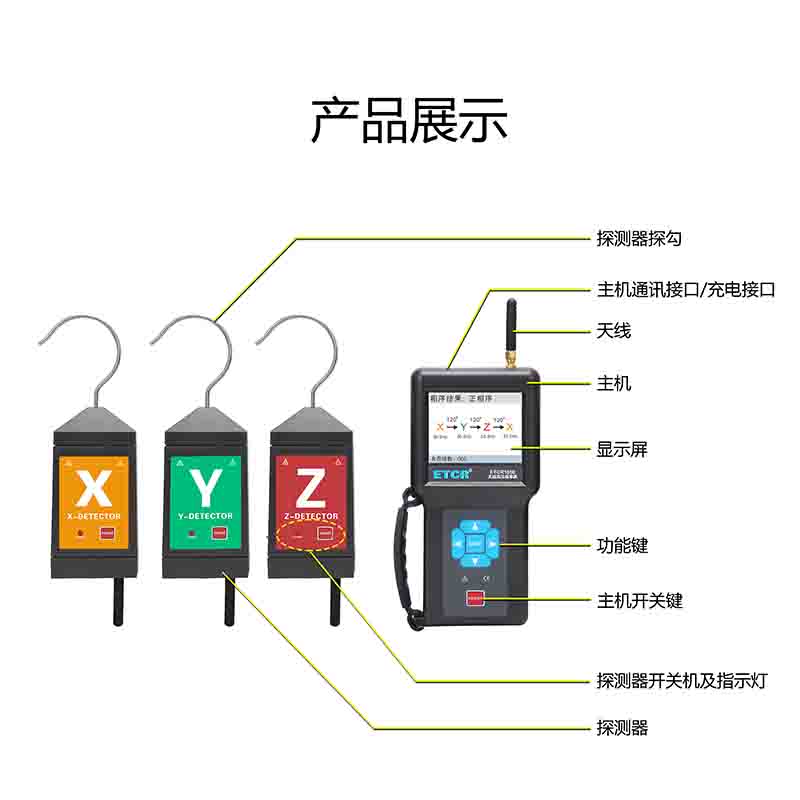 ETCR1050無線高壓相序測試儀由主機(jī)、3個探測器、伸縮絕緣桿、數(shù)據(jù)上傳軟件、USB通訊線等組成,主機(jī)采用3.5寸真彩液晶屏,可以同屏顯示相位、頻率、相序及核相結(jié)果,向量圖指示、相位指示清晰直觀,具有“X信號正常、Y信號正常、Z信號正常、正相序、反相序、同相、異相”等語音提示功能,使測試更簡單輕松。儀表有USB通信接口,存儲數(shù)據(jù)可上傳電腦進(jìn)行歷史數(shù)據(jù)讀取、查閱、保存、打印。