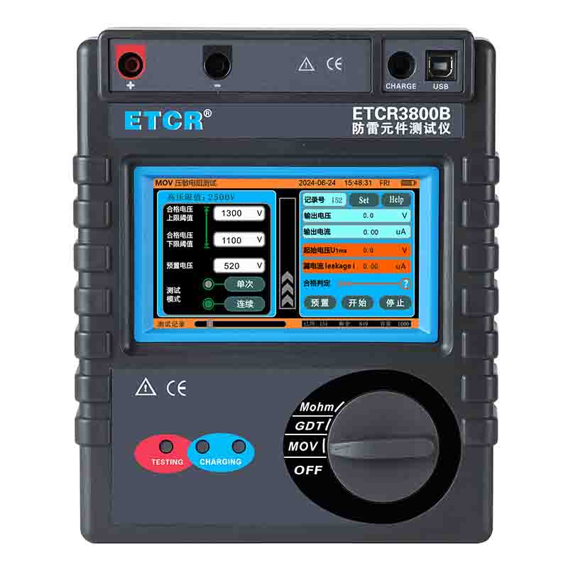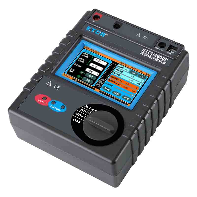 ETCR3800B智能型防雷元件測試儀又稱防雷元件測試表、SPD現(xiàn)場測試儀、壓敏電阻測試儀、浪涌保護(hù)器測試儀,用于測量各種壓敏電阻(MOV)、氣體放電管(GDT)、浪涌保護(hù)器(SPD)性能參數(shù)測試,還具有絕緣電阻、吸收比、極化指數(shù)測試功能。儀表具有獨特的高壓短路保護(hù)、過流保護(hù)功能,專業(yè)級的參數(shù)設(shè)置功能、高壓限值設(shè)定、升壓速度設(shè)定、合格范圍設(shè)定、合格判斷篩選、自動量程調(diào)節(jié)等功能。還具有單件測試模式、連續(xù)測試模式功能,特別適合批量元件測試。儀器廣泛用于避雷器、防雷器、浪涌保護(hù)器、壓敏電阻、金屬陶瓷放電管、真空避雷管等過壓防護(hù)元件性能參數(shù)的測試。是氣象防雷、電力、通信、機(jī)電安裝和維修、防雷元件生產(chǎn)廠家、以及工業(yè)企業(yè)部門常用必備的儀表。