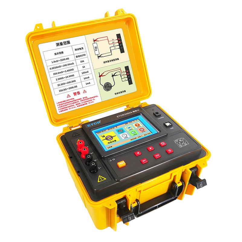ETCR3660A微歐計又稱直流電阻測試儀、直流低值電阻測試儀,儀表采用微處理機技術,精密四線法測試,準確可靠。主要用于測量小型變壓器繞組電阻;接地導通電阻;電纜導線電阻;開關、接插件、繼電器的接觸電阻;金屬鉚接電阻;線圈、電動機、互感器繞組電阻;金屬構件之間聯(lián)結電阻;電焊接點電阻;蓄電池并聯(lián)連接電阻;以及導線長度測量計算等。儀表外殼采用防水保護箱,防撞、防摔、防水(防護等級IP65)堅固安全耐用,儀表還配有大容量可充電鋰電池組,特別適合在戶外工地使用。廣泛應用于建筑質檢站、監(jiān)理公司、建筑施工單位、防雷公司、電力部門、船舶機車廠等。
