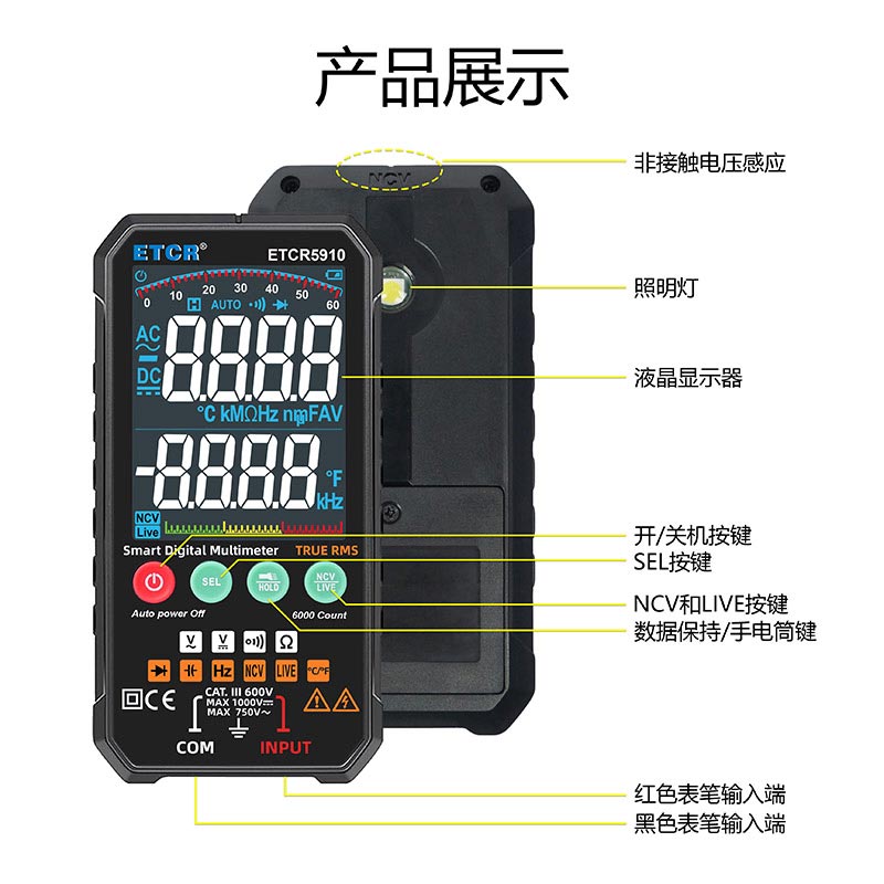 1. 便攜式6000計數(shù)自動量程數(shù)字多用表,全新設(shè)計,結(jié)構(gòu)精巧、操作容易、攜帶方便,是電工電子測量之理想工具。