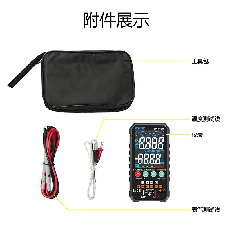 隨機附件 | 儀表:1件; 表筆:1付;溫度探頭:1條; LR03電池:2節(jié);工具包:1個 |