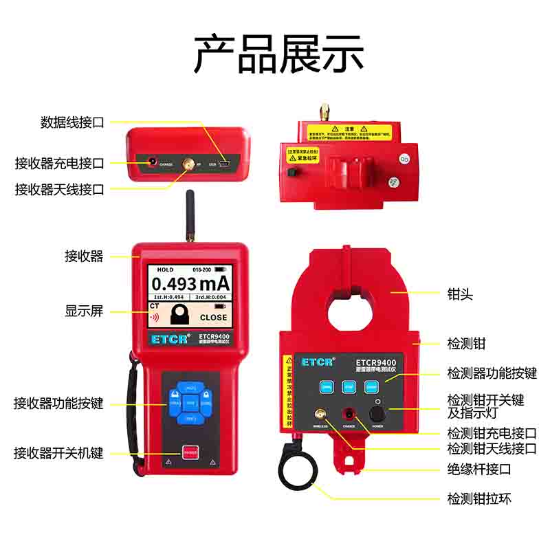 ETCR9400氧化鋅避雷器鉗形帶電測試儀由主機、檢測儀、絕緣桿組成。主機與檢測儀采用無線通訊,通訊距離30米,主機可遙控檢測儀鉗頭的張開或閉合完成測試過程,主機能實時顯示電流測試值及鉗頭狀況。檢測儀采用微型馬達(dá)驅(qū)動鉗頭的張開或閉合,鉗頭采用高性能坡莫合金制作,具有超強的抗干擾能力,幾乎不受外部磁場的影響,分辨率高達(dá)1uA。檢測儀可連接絕緣桿用于高壓線路的氧化鋅避雷器測試。儀表也可做超高精度鉗形漏電流表使用。儀表還具有數(shù)據(jù)保持、數(shù)據(jù)存儲功能,配有USB接口,存儲數(shù)據(jù)可上傳電腦。