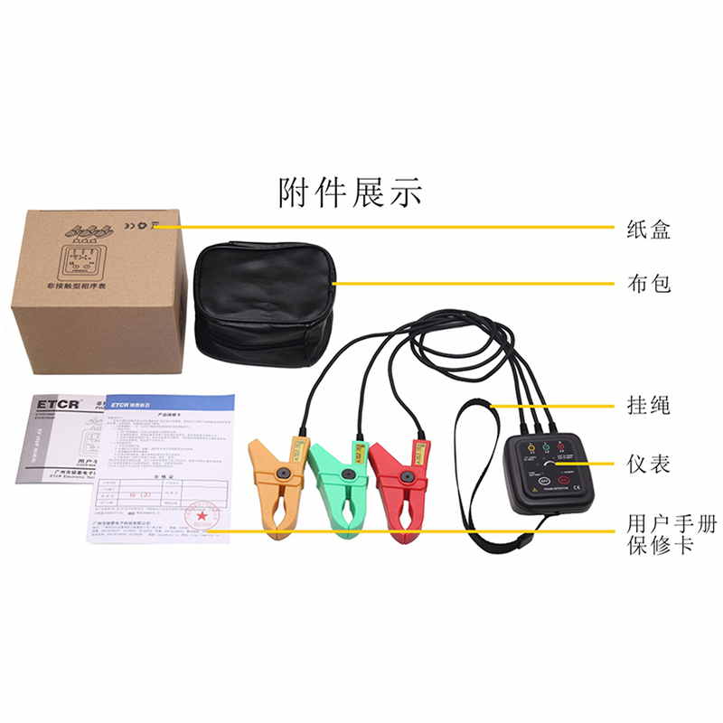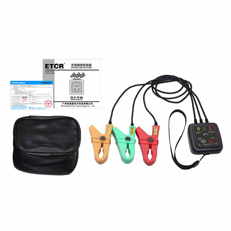 ETCR1000D非接觸型檢相器又稱非接觸相序表、相序檢測儀、電機三相檢測儀、相序測試儀、馬達(dá)轉(zhuǎn)向測試儀,用于相序檢測(正相、逆相、缺相)、活線檢查、簡易檢電、火線識別、缺相判斷、斷線位置查找、線路檢修。