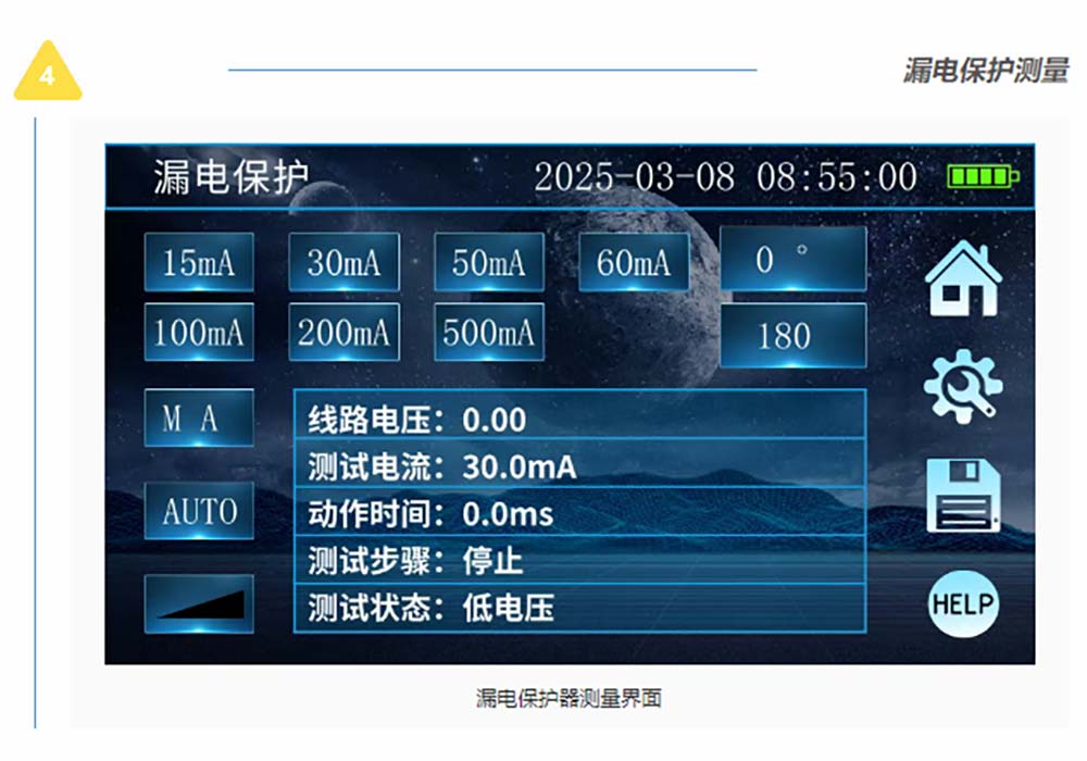 接地/絕緣/直流電阻測(cè)試、RCD漏電保護(hù)檢測(cè)、電氣插座檢測(cè)、電流有效值測(cè)試、交流電壓測(cè)試、相序測(cè)試等電力參數(shù)測(cè)試。